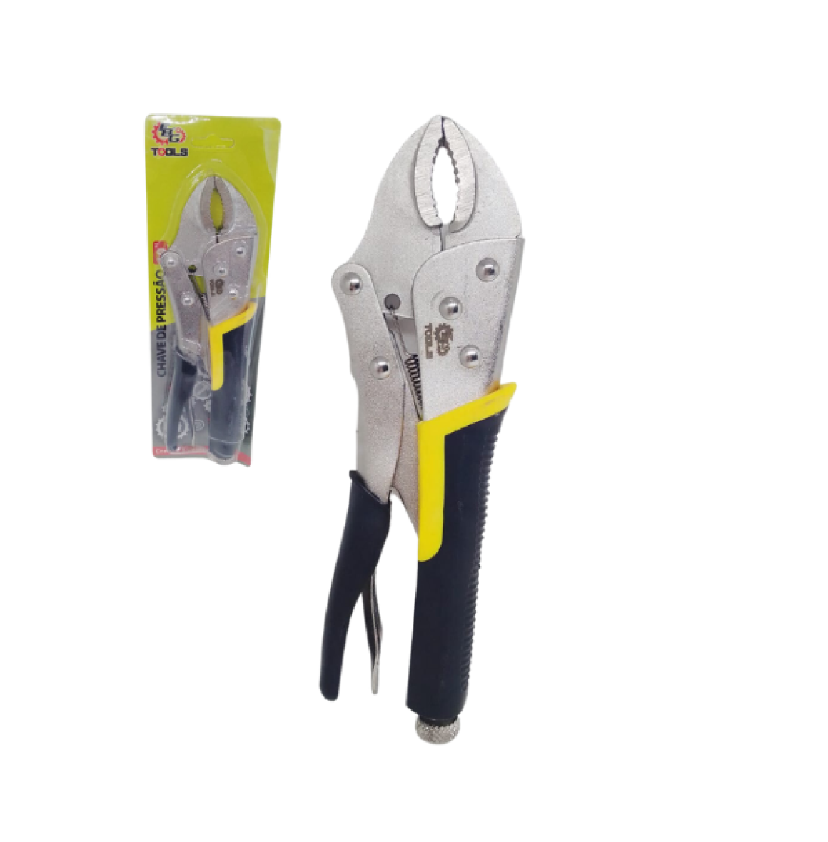 Descrição: Chave de pressão com cabo emborrachado indicada para uma variedade de tarefa, desde prender, apertar parafusos até segurar com mais firmeza. A chave é feita com aço carbono de alta qualidade, forte e durável. Cabo emborrachado para proporcionar um aperto confortável e seguro. Mandibulas curvas com 4 pontos sobre porcas e parafusos de contato para maior pressão. Alavanca de rápida liberação.