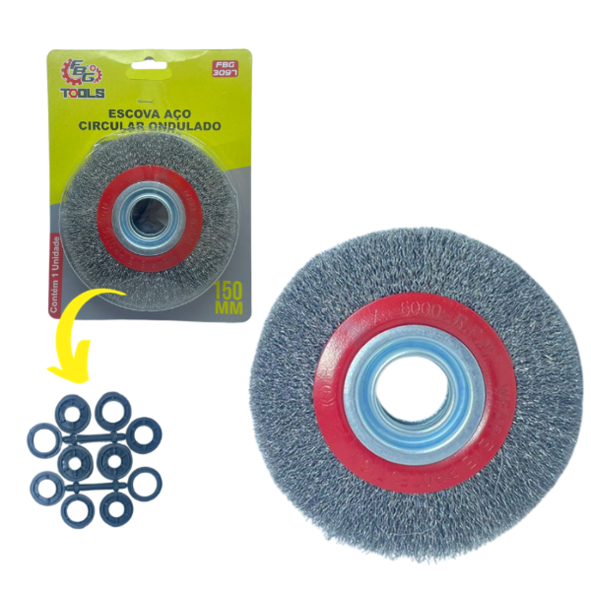 Descrição: Escova de aço circular com cerdas para limpeza de peças, remoção de ferrugem, vernizes e crostas de soldas.