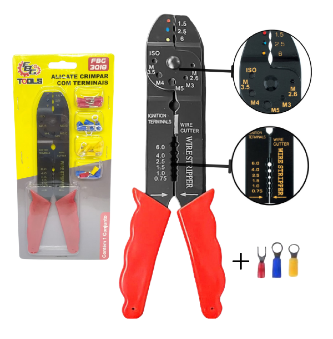 Descrição: Alicate Crimpar ideal para desencapar cabos e fios decobre e aluminio. Para crimpar terminais isolados e terminais não isolados. Com 25 terminais sortidos - 7 Conector de topo / 7 Terminal de anel / 5 Terminal pa / 6 Desconexão fêmea