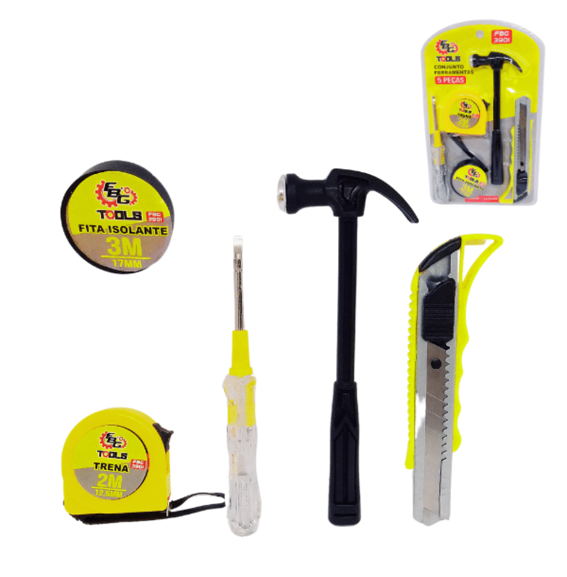 Descrição: Conjunto com 5 peças contendo - 1 Trena 2 metros / 1 Martelo / 1 Estilete / 1 Fita isolante 3m / 1 Chave com duas pontas (Philis e Fenda)