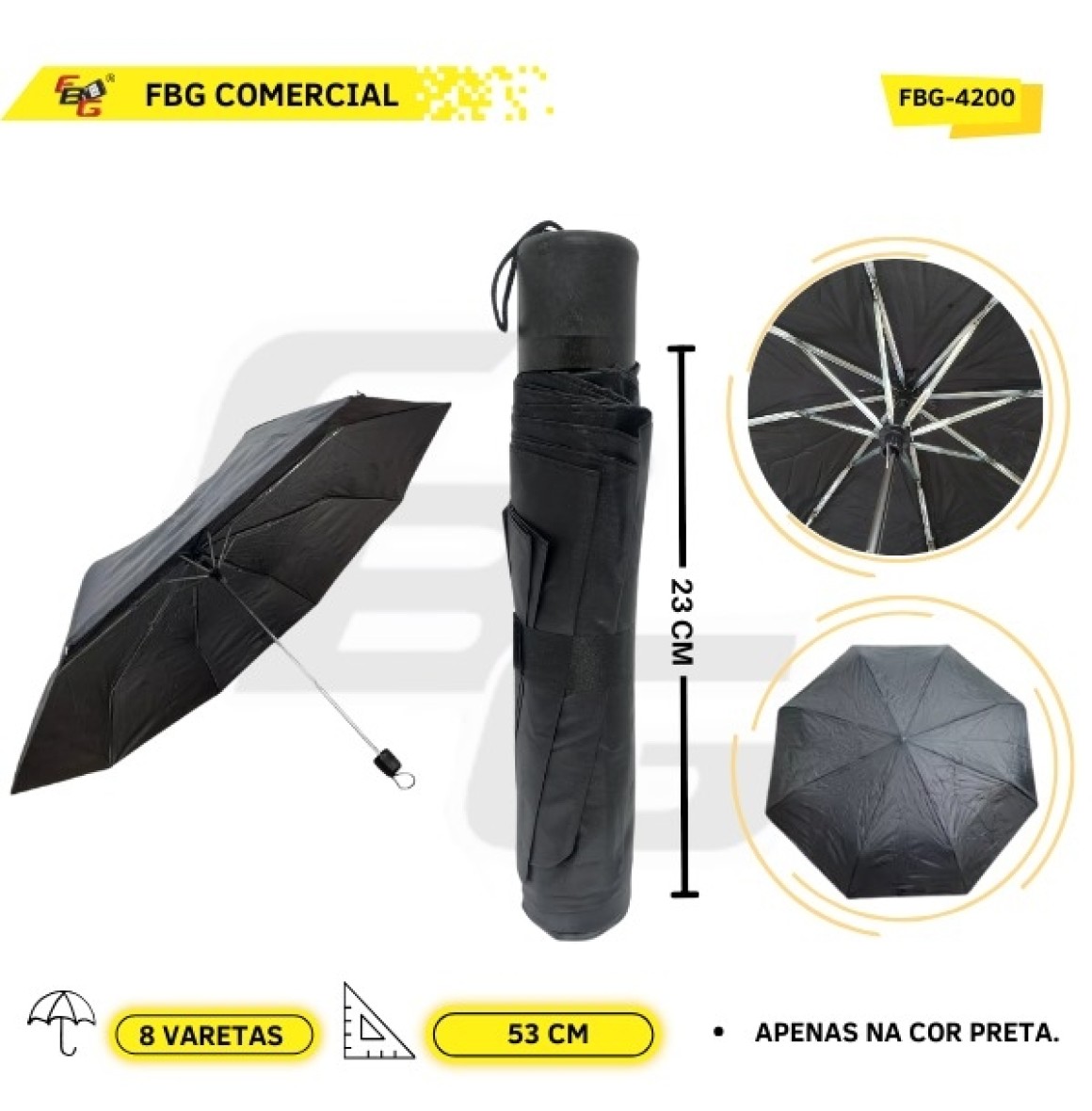 Descrição: Sombrinha de 53 cm com 8 varetas, abertura manual. Disponível na cor preta.