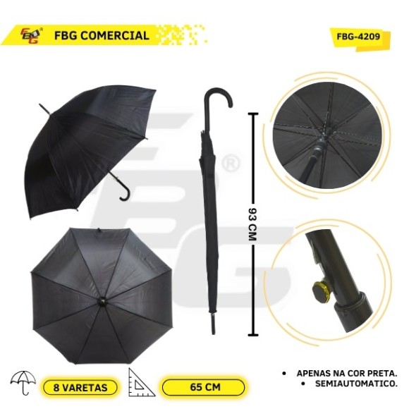 Descrição: Guarda chuva de 65cm com 8 varetas, abertura automática, cabo curvado. Disponível na cor preto.