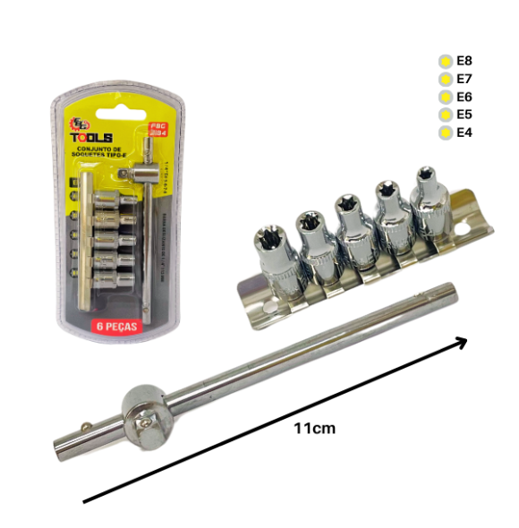 Descrição: Conjunto de soquetes tipo-E. Ideal para apertar e desapertar parafusos em motores automotivos e máquinas em geral.