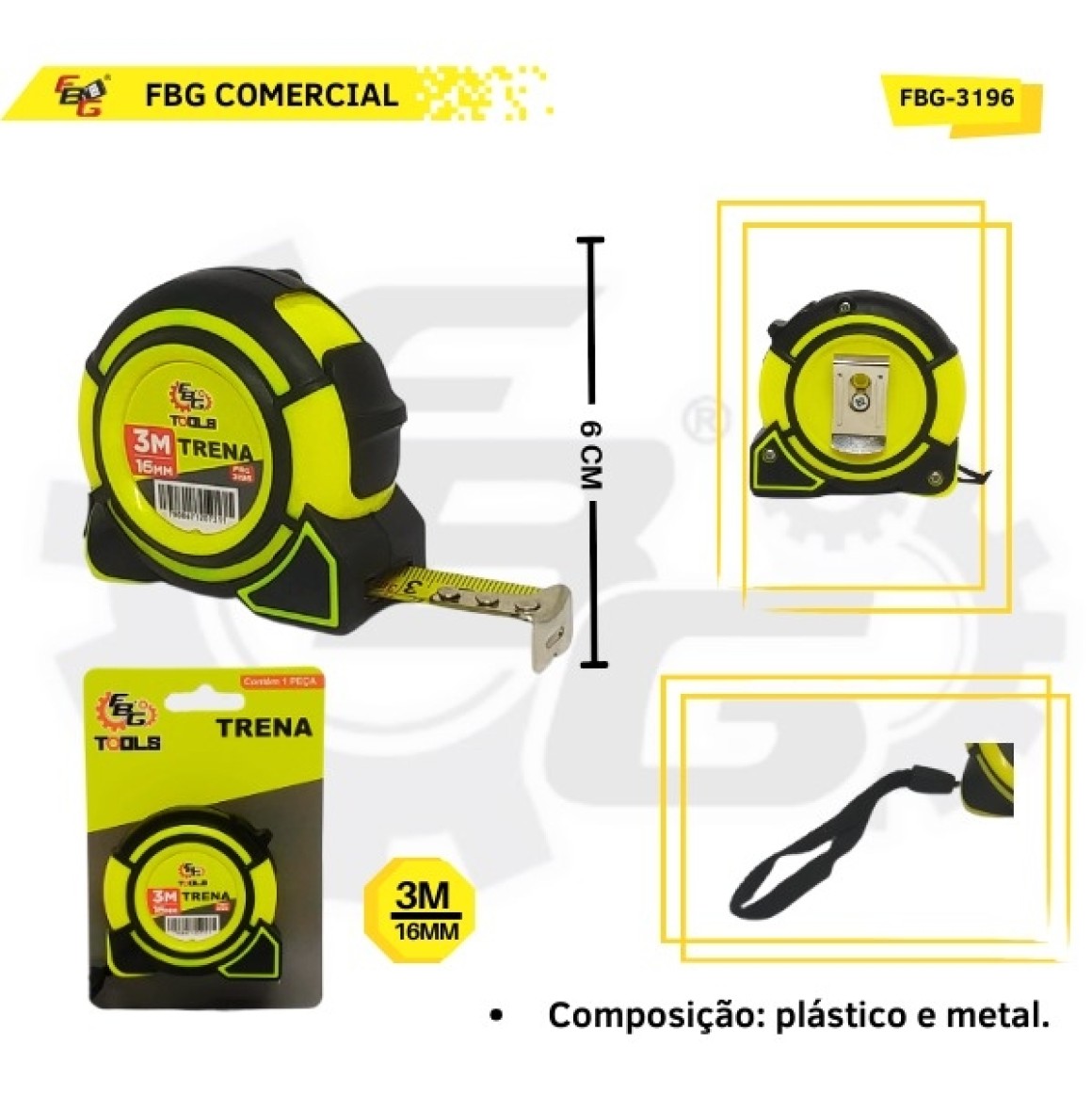 Descrição: Trena de 3M. Para medir com eficiência, a trena com fita de 16mm de 3M é a escolha certa.