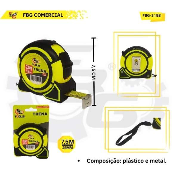 Descrição: Trena de 7,5M. Para medir com eficiência, a trena com fita de 25mm de 7,5M é a escolha certa.