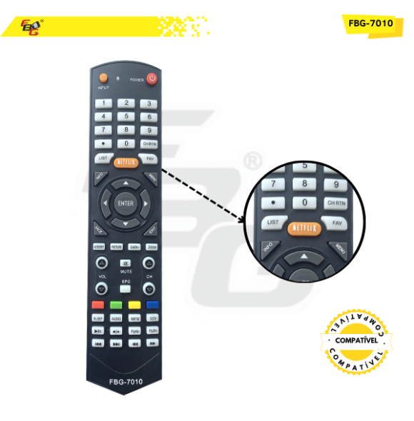 O Controle Remoto da FBG da foi projetado para oferecer praticidade, qualidade e durabilidade. Fabricado com materiais de alta qualidade, ele possui teclas macias, plástico resistente e um LED transmissor com excelente tempo de resposta, garantindo uma experiência de uso rápida e eficiente.