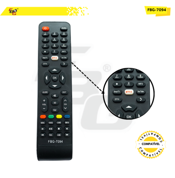 O Controle Remoto da FBG da foi projetado para oferecer praticidade, qualidade e durabilidade. Fabricado com materiais de alta qualidade, ele possui teclas macias, plástico resistente e um LED transmissor com excelente tempo de resposta, garantindo uma experiência de uso rápida e eficiente.